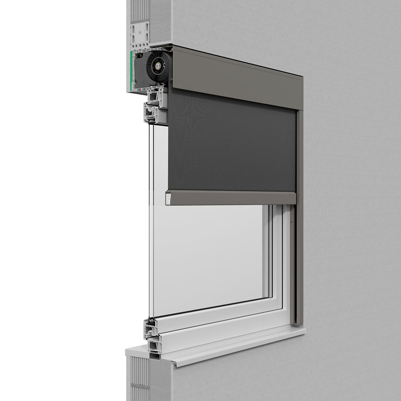 Das Textilscreens-Aufsatzsystem aus Kunststoff. Optional mit außenliegenden Putzträgern oder Aluminiumaußenblende. Die Kastenteile zum Rauminneren bestehen aus einer doppelten Hohlkammer und sorgen somit für Stabilität, Isolierfähigkeit und hohe Schallschutzwerte.